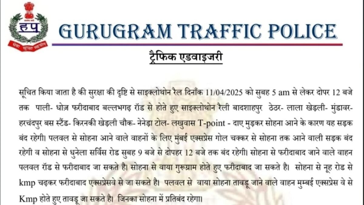 Gurugram News Network – 11 अप्रैल को नशे के विरूध जागरूक करने के लिए गुरुग्राम में साइक्लोथोन साइकिल रैली पहुंचेगी। इस दौरान सात घंटे तक कुछ सड़कों पर डायर्वजन किया गया है। ट्रैफिक पुलिस के अनुसार 11 अप्रैल को सुबह पांच बजे से लेकर दोपहर 12 बजे रास्ता बंद रहेगा। एडवाइजारी के अनुसा पाली- धोज़ फरीदाबाद बल्लभगढ़ रोड से होते…