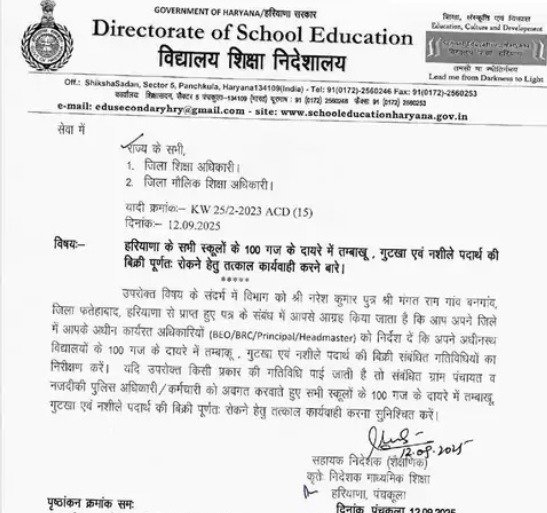 यह महत्वपूर्ण फैसला फतेहाबाद के निवासी द्वारा भेजे गए एक पत्र के बाद लिया गया है। विभाग को पत्र लिखकर स्कूलों के आसपास बिकने वाले तंबाकू उत्पादों से बच्चों पर पड़ने वाले बुरे प्रभाव के बारे में बताया था। उनकी इस पहल पर संज्ञान लेते हुए, विद्यालय शिक्षा निदेशालय ने तुरंत कार्रवाई की और प्रदेश के सभी जिला शिक्षा अधिकारियों (DEO) और जिला मौलिक शिक्षा अधिकारियों (DEEO) को पत्र जारी कर निर्देश दिए हैं।