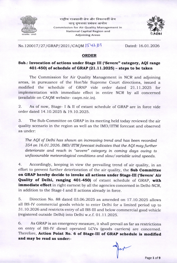 GRAP III : Delhi NCR की हवा एक बार फिर ‘गंभीर’ (Severe) श्रेणी की ओर बढ़ रही है। दिल्ली-एनसीआर में प्रदूषण की गंभीर स्थिति को देखते हुए वायु गुणवत्ता प्रबंधन आयोग (CAQM) ने GRAP (ग्रैप) का तीसरा चरण (Stage-III) फिर से लागू कर दिया है । यह आदेश 16 जनवरी 2026 से तत्काल प्रभाव से लागू हो गया है ।