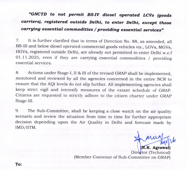 बाहरी डीजल वाहन: दिल्ली के बाहर पंजीकृत BS-IV और उससे नीचे के डीजल हल्के वाणिज्यिक वाहन (LCVs) दिल्ली में प्रवेश नहीं कर सकेंगे, सिवाय उनके जो आवश्यक वस्तुएं या सेवाएं प्रदान कर रहे हैं।