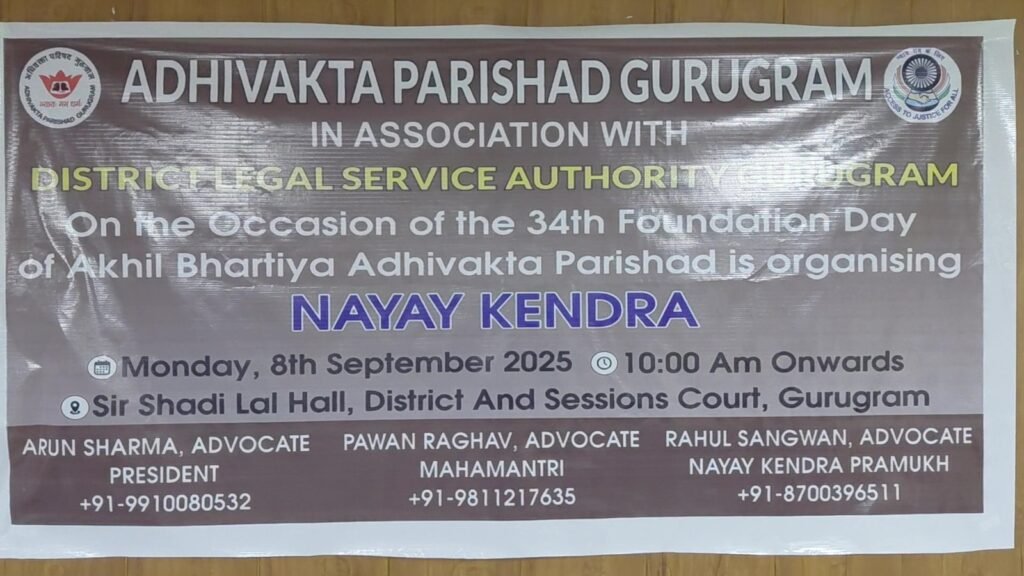 अधिवक्ता परिषद गुड़गांव के मीडिया प्रभारी एडवोकेट मनीष शांडिल्य ने बताया कि परिषद पिछले 34 वर्षों से जरूरतमंदों को मुफ्त कानूनी सहायता मुहैया करा रहा है।