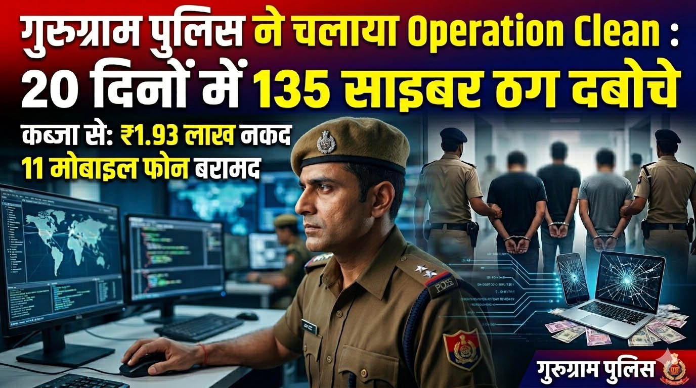 Operation Clean : साइबर सिटी में सक्रिय ठगों के खिलाफ गुरुग्राम पुलिस ने अब तक का सबसे बड़ा और निर्णायक अभियान छेड़ दिया है। पुलिस की साइबर अपराध टीमों ने पिछले तीन हफ्तों (01 अप्रैल से 20 अप्रैल 2026 तक) के भीतर ताबड़तोड़ छापेमारी करते हुए कुल 135 शातिर आरोपियों को गिरफ्तार किया है। पुलिस की इस सख्त कार्रवाई से साइबर अपराधियों के बीच हड़कंप मच गया है।