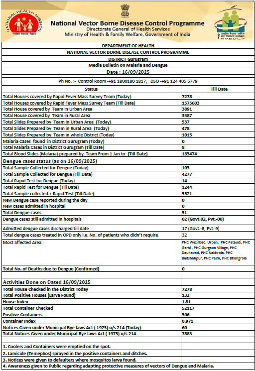 गुरुग्राम स्वास्थ्य विभाग के आंकड़ों के अनुसार, इस साल 16 सितंबर तक डेंगू के 51 मामले सामने आ चुके हैं । जिनमें से अभी भी सरकारी अस्पताल में दो मरीज़ो का इलाज चल रहा है । डेंगू के अभी तक गुरुग्राम में 5521 लोगों के सैंपल लिए जा चुके हैं जिनमें से 51 मामले पॉजीटिव मिले हैं । जबकि इस साल गुरुग्राम में मलेरिया के भी 8 मामले सामने आ चुके हैं ।