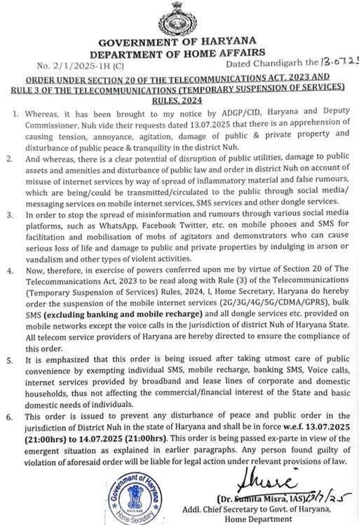 कानून-व्यवस्था बनाए रखने के लिए, गृह विभाग की अतिरिक्त मुख्य सचिव ने 13 जुलाई की रात 9 बजे से 14 जुलाई रात 9 बजे तक यानी पूरे 24 घंटे के लिए नूंह में इंटरनेट सेवा और बल्क SMS पर प्रतिबंध लगा दिया है। हालांकि, बैंकिंग और मोबाइल रिचार्ज से जुड़ी SMS सुविधाएं इस दौरान भी चालू रहेंगी