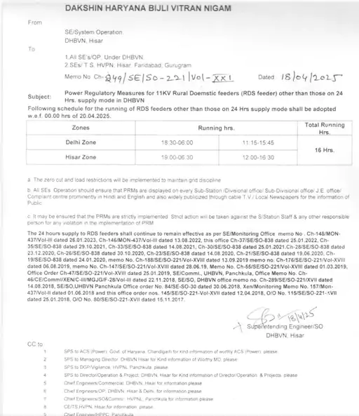 दक्षिण हरियाणा बिजली वितरण निगम लिमिटेड (DHBVNL) के सुपरिंटेंडिंग इंजीनियर कार्यालय हिसार से जारी आदेश के अनुसार, 11kv ग्रामीण घरेलू फीडरों के लिए नया शेड्यूल कल से प्रभावी होगा। इसके अनुसार, दिल्ली जोन में शाम साढ़े 6 बजे से अगले दिन सुबह 6 बजे तक बिजली आपूर्ति की जाएगी। वहीं, सुबह सवा 11 बजे से दोपहर पौने 4 बजे तक बिजली दी जाएगी। कुल मिलाकर 24 घंटे के दौरान कुल 16 घंटे ही बिजली मिलेगी। जबकि, 8 घंटे बिजली कटौती की जाएगी।