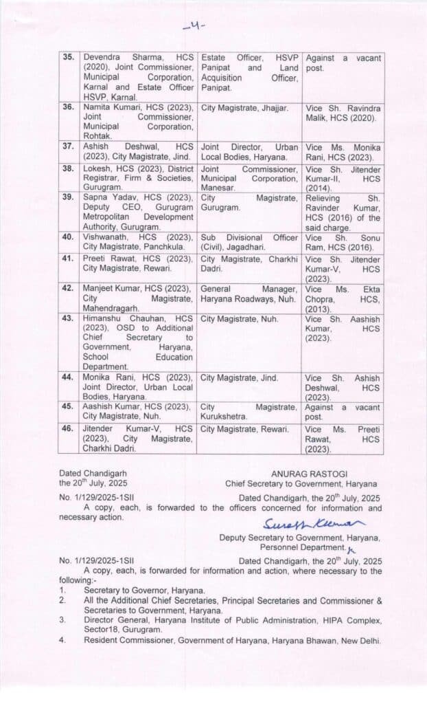 Haryana IAS and HCS Transfer: हरियाणा में बड़ा प्रशासनिक फेबदल हुआ है। जिसके चलते 2 IAS और 44 HCS अधिकारियों के हुए तबादले हुए है। जिसके तहत IAS अधिकारी दीपक बाबुलाल को कैथल में म्युनिसिपल कमिश्नर लगाया गया है। इसी तरह से आईएएस निशा को पंचकूला जिला परिषद की सीईओ लगाया गया है।
