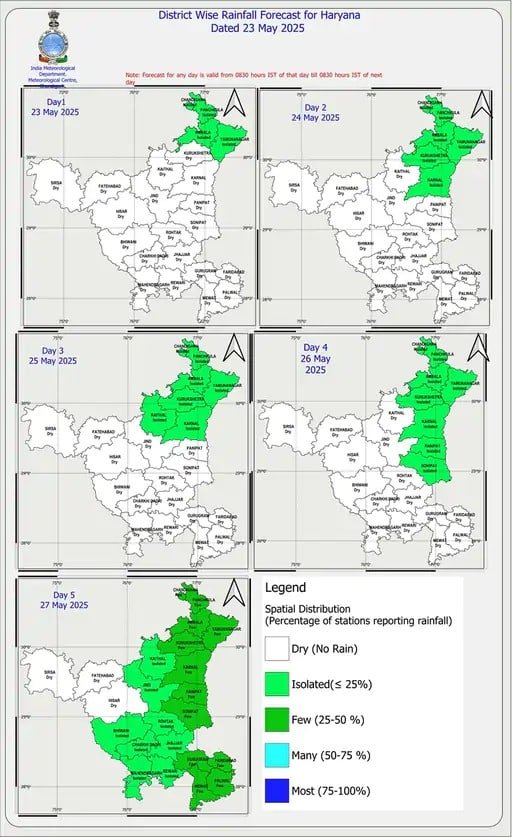 वहीं कल 25 मई को 6 जिलों अंबाला, यमुनागर, पंचकूला, कुरुक्षेत्र ,करनाल और कैथल में 25 प्रतिशत बारिश के आसार है। 26 मई को प्रदेश के 7 जिलों पंचकूला, अंबाला, यमुनानगर, कुरुक्षेत्र, करनाल, पानीपत और सोनीपतमें 25 प्रतिशत बारिश की संभावना है।