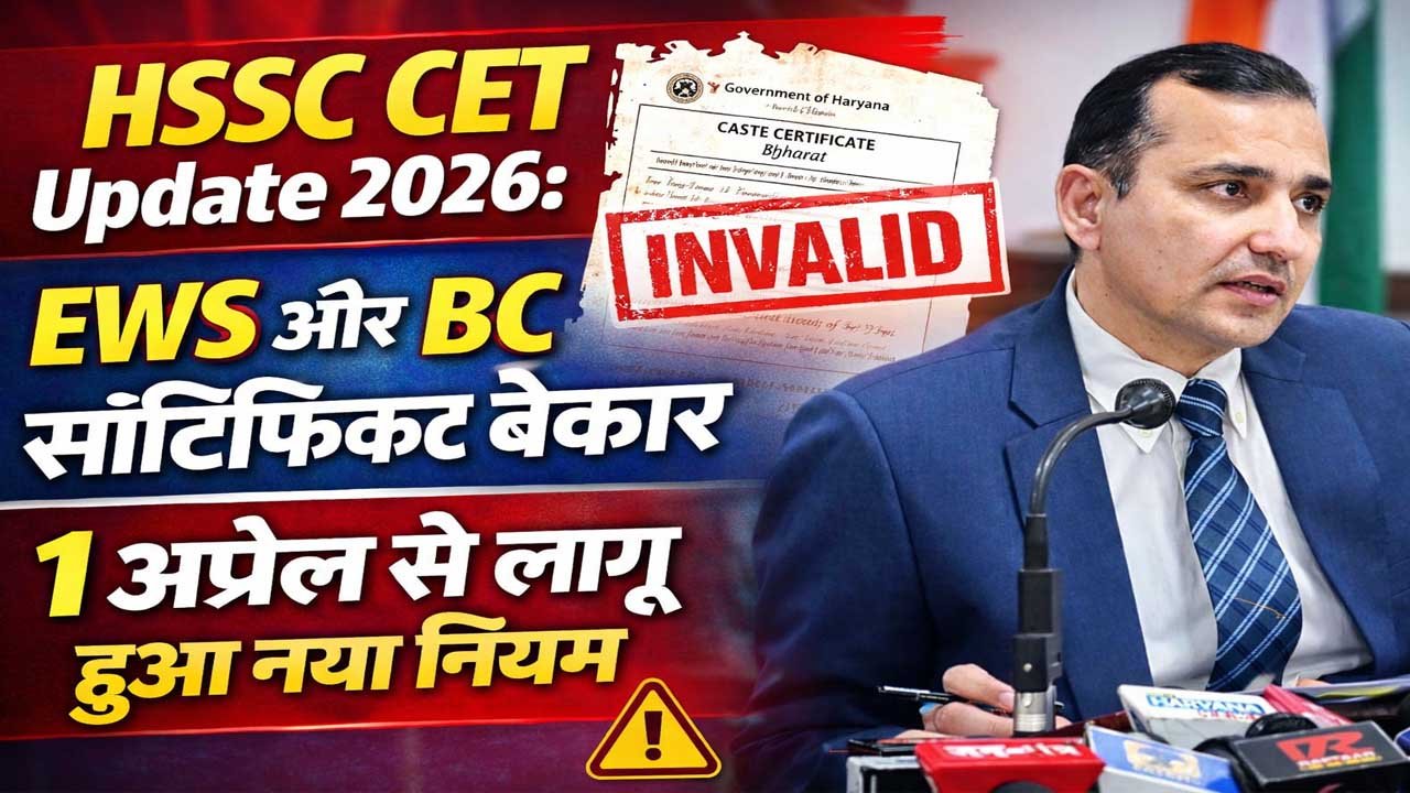 Haryana News : हरियाणा स्टाफ सिलेक्शन कमीशन (HSSC) ने नया अपडेट जारी किया है हरियाणा के जो युवा HSSC (CET), HPSC और हरियाणा की सरकारी नौकरियों की तैयारी कर रहे हैं उनको अब 3 कैटेगरी के सर्टिफिकेट नए सिरे से बनवाने होंगे । इनमें BC-A, BC-B और EWS सर्टिफिकेट शामिल हैं । इन कैटेगरी के 31 मार्च 2026 से पहले बनवाए गए सर्टिफिकेट अब मान्य नहीं होंगे ।