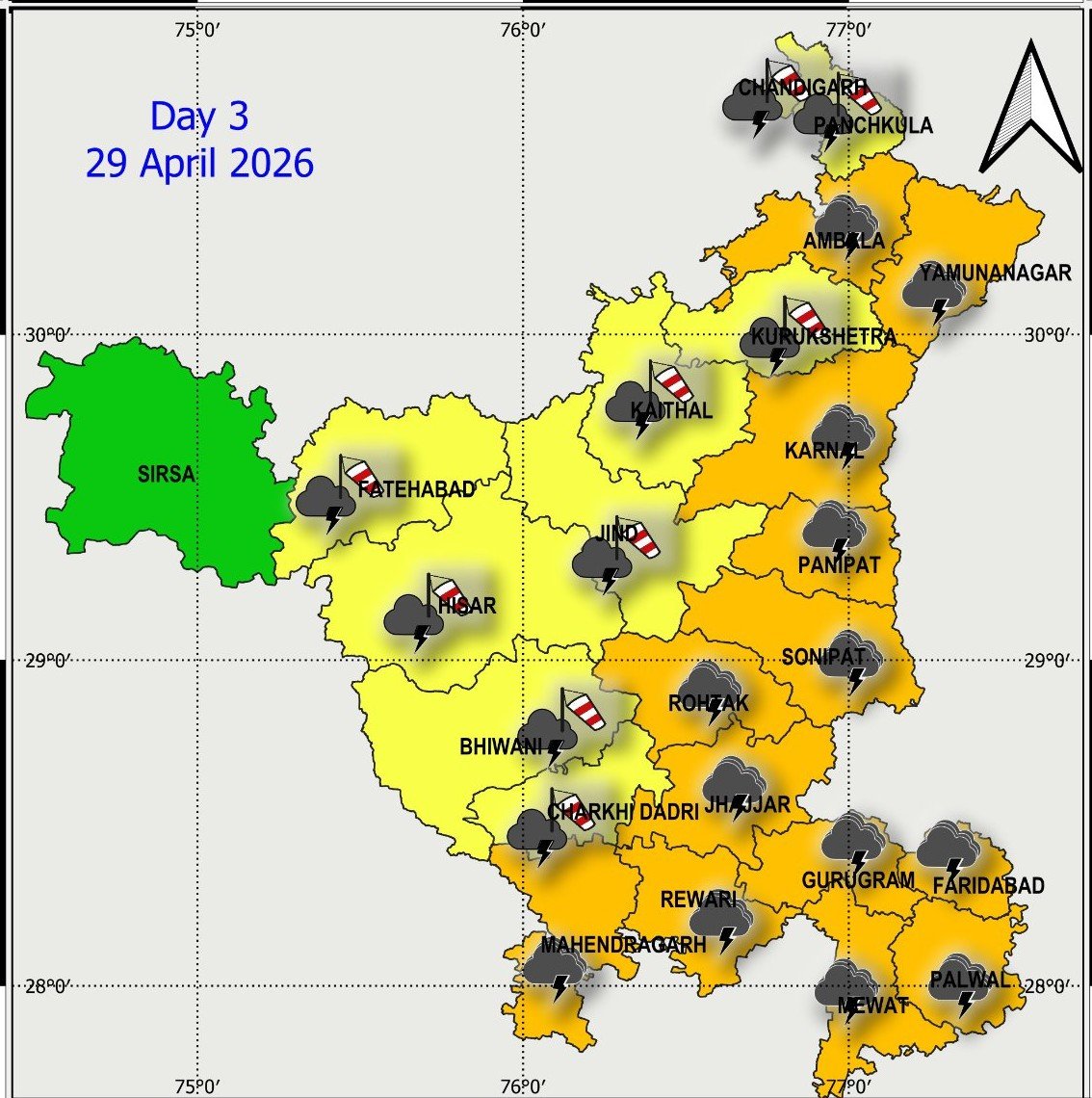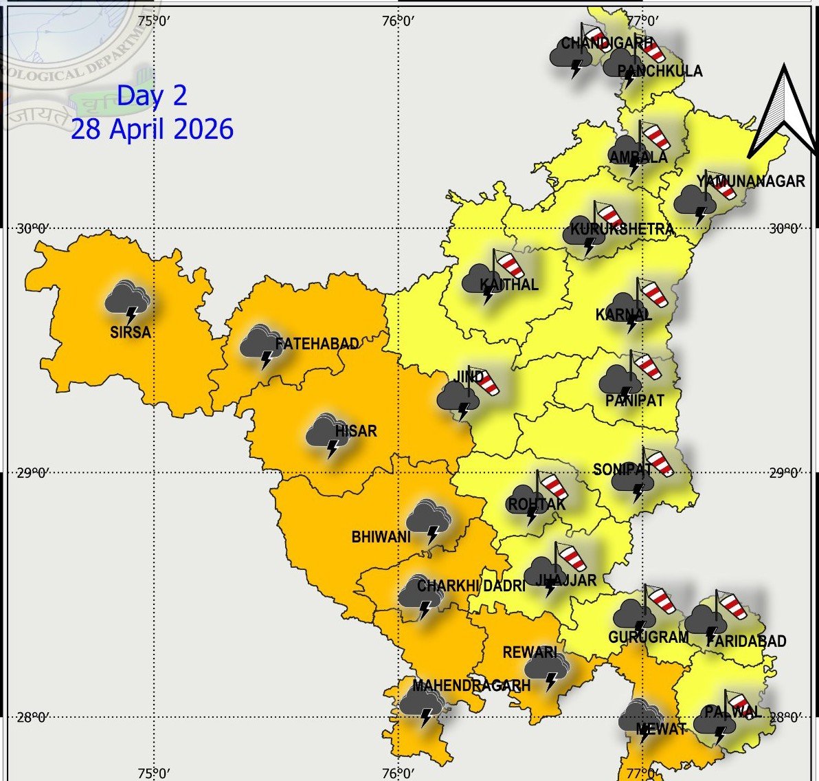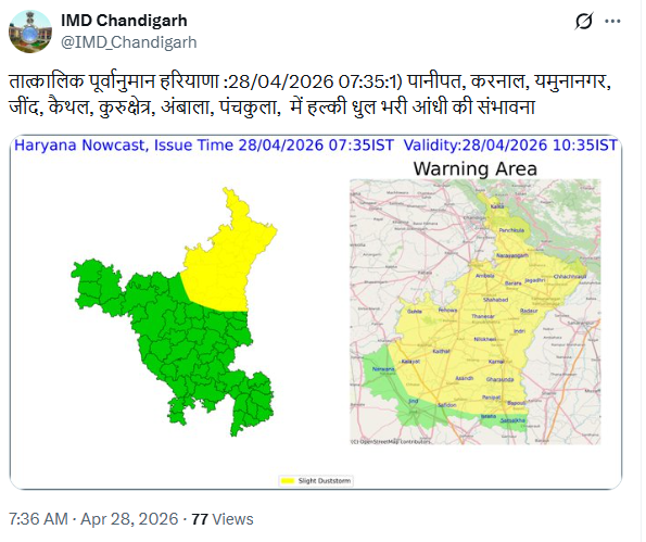 वहीं मौसम विभाग ने लगभग पूरे हरियाणा तेज़ धूल भरी आंधी और बारिश का येलो-ऑरेंज अलर्ट जारी किया है । हरियाणा में दो दिनों तक मौसम इसी तरह परिवर्तनशील बना रहेगा । IMD के अनुसार 28 अप्रैल को गुरुग्राम समेत आधे हरियाणा में येलो अलर्ट जारी किया गया है । इस दौरान गुरुग्राम में 40-50 KMPH की रफ्तार से धूल भरी आंधी चलने का अलर्ट जारी किया है ।