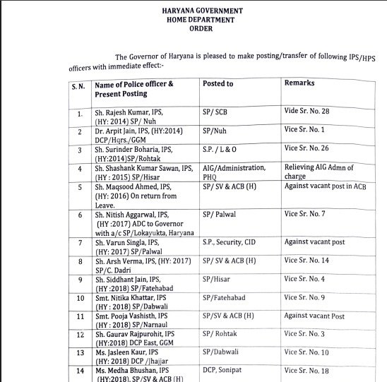 सरकार द्वारा जारी सूची के अनुसार, कई जिलों के पुलिस अधीक्षकों (SP) के कार्यक्षेत्र बदल दिए गए हैं। नूह से राजेश कुमार (IPS) को नूह से हटाकर स्टेट क्राइम ब्रांच (SCB) भेजा गया है, जबकि गुरुग्राम के DCP हेडक्वार्टर डॉ. अर्पित जैन अब नूह के नए SP होंगे । गौरव राजपुरोहित को रोहतक का नया SP नियुक्त किया गया है।