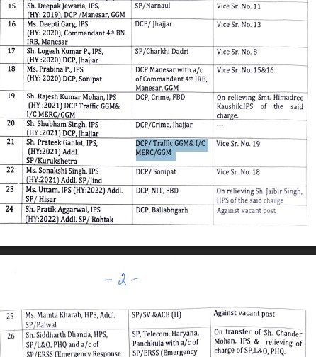 साइबर सिटी गुरुग्राम और औद्योगिक नगरी फरीदाबाद की कानून व्यवस्था को नया रूप देने के लिए महत्वपूर्ण नियुक्तियां की गई हैं। संदीप कुमार (HPS) को गुरुग्राम का नया DCP ईस्ट नियुक्त किया गया है । प्रबीना पी. (IPS) को गुरुग्राम का DCP मानेसर लगाया गया है, उनके पास चौथी IRB बटालियन के कमांडेंट का अतिरिक्त प्रभार भी रहेगा ।