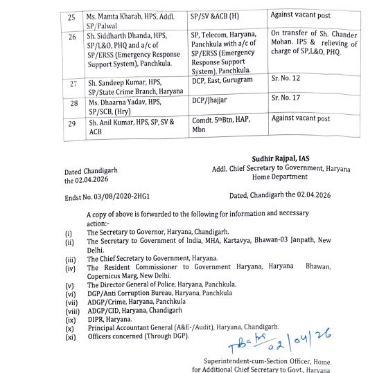 Haryana Police में बड़ा फेरबदल: आधी रात को बदलें 29 IPS-HPS अधिकारी, देखे पूरी लिस्ट