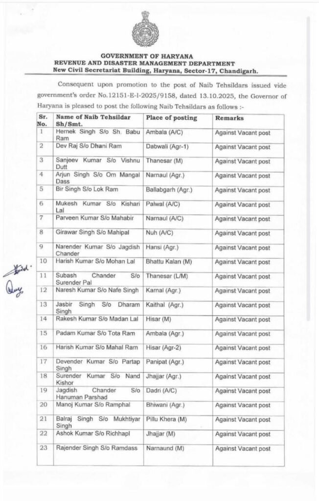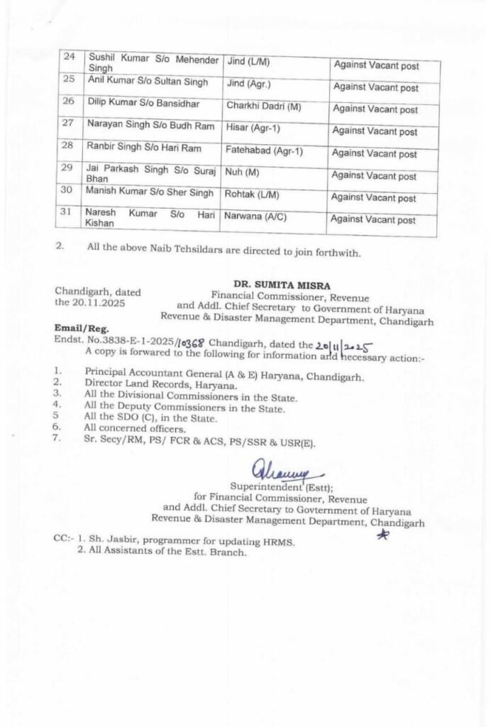 Revenue Department : हरियाणा राजस्व एवं आपदा प्रबंधन विभाग ने प्रशासनिक दक्षता को सुदृढ़ करने की दिशा में एक बड़ा और महत्वपूर्ण कदम उठाया है। विभाग की वित्तायुक्त डॉ. सुमिता मिश्रा ने कानूनगो के पदों से पदोन्नत हुए 31 नायब तहसीलदारों को तत्काल प्रभाव से उनके नए कार्यक्षेत्रों में तैनाती दे दी है।