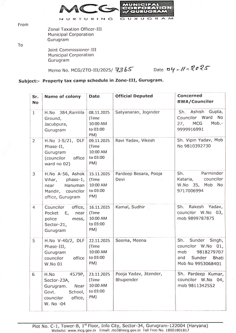 MCG Special Camp : नगर निगम गुरुग्राम (MCG) ने जोन-3 क्षेत्र के नागरिकों की सुविधा के लिए एक बड़ी पहल की है। निगम 8 नवंबर से 30 नवंबर तक विभिन्न स्थानों पर विशेष कैंपों का आयोजन करेगा, जहाँ नागरिकों को प्रॉपर्टी टैक्स से जुड़े डाटा सुधार, टैक्स भुगतान, और पेयजल कनेक्शन संबंधी शिकायतों का त्वरित समाधान मौके पर ही मिलेगा।