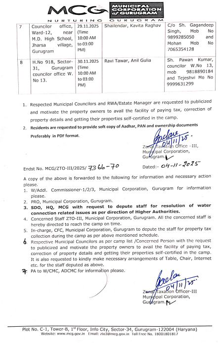 MCG Special Camp : प्रोपर्टी टैक्स -पानी बिल के आठ नवंबर से लगेंगे कैंप, देखें पूरी लिस्ट