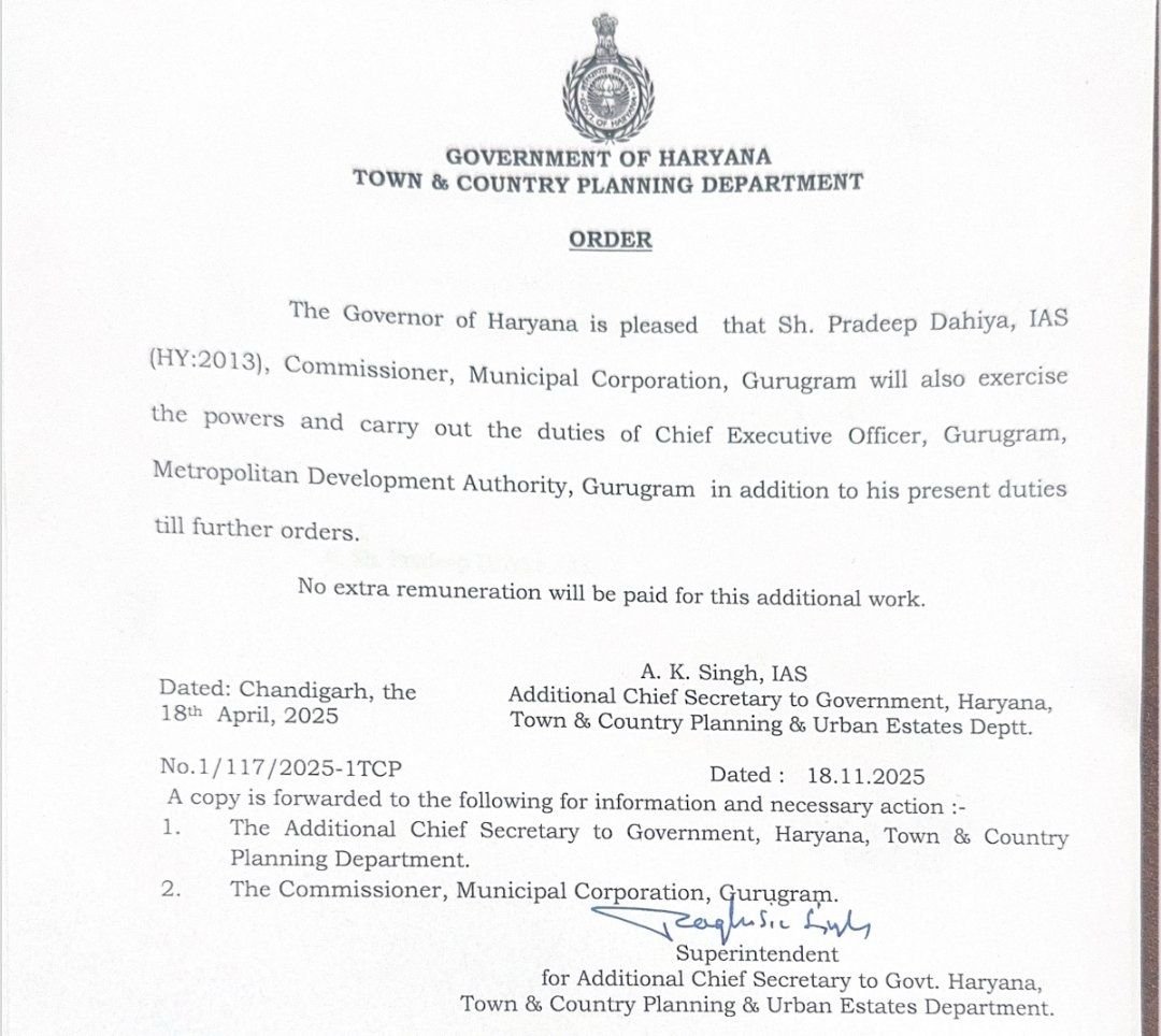New Orders : हरियाणा सरकार द्वारा किए गए एक महत्वपूर्ण प्रशासनिक निर्णय ने गुरुग्राम के शहरी विकास और नागरिक प्रबंधन को एक समेकित दिशा देने का मार्ग प्रशस्त किया है। IAS अधिकारी प्रदीप दाहिया को उनके मौजूदा पद कमिश्नर नगर निगम, गुरुग्राम (MCG) के साथ-साथ अब गुरुग्राम महानगर विकास प्राधिकरण (GMDA) के मुख्य कार्यकारी अधिकारी (CEO) का अतिरिक्त प्रभार भी सौंप दिया गया है।
