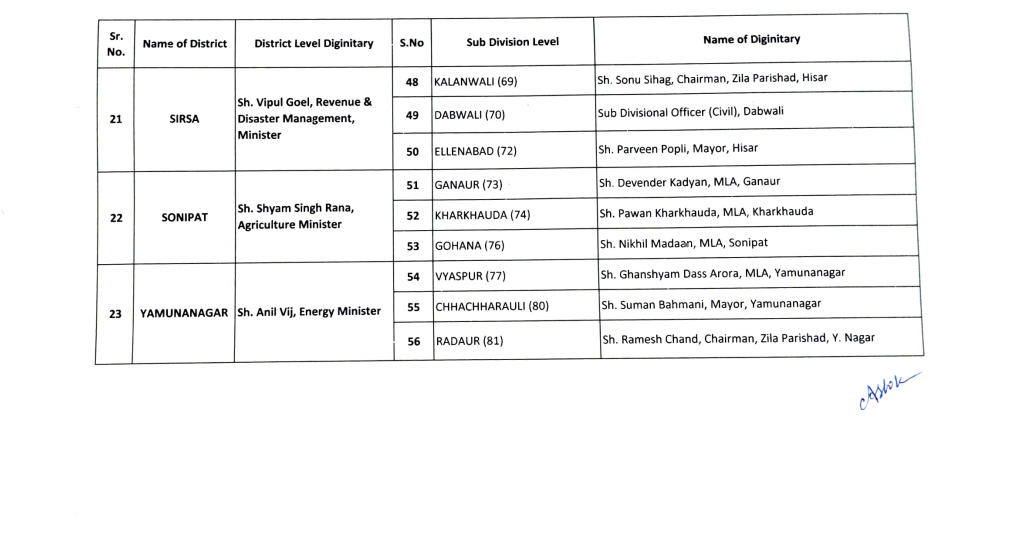 दिग्गजों की तैनाती और नई जिले की सुगबुगाहट सूची में सबसे चौंकाने वाला और महत्वपूर्ण नाम पूर्व मुख्यमंत्री मनोहर लाल खट्टर का है, जो हांसी में ध्वजारोहण करेंगे। हांसी को लंबे समय से जिला बनाने की मांग उठती रही है और सरकार द्वारा वहां पूर्व मुख्यमंत्री को भेजना इस क्षेत्र के बढ़ते राजनीतिक महत्व को दर्शाता है।