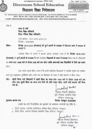School News : हरियाणा में दुर्गा अष्टमी के पावन अवसर पर स्कूलों के समय में बदलाव किया गया है। अब 30 सितंबर (मंगलवार) को प्रदेश के सभी राजकीय विद्यालय सुबह 10 बजे से दोपहर 2:30 बजे तक खुलेंगे। यह फैसला विद्यालय शिक्षा निदेशालय ने लिया है, जिसके लिए सभी जिला शिक्षा अधिकारियों को एक पत्र भी जारी किया गया है।